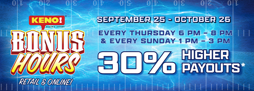 *Winning KENO! tickets purchased at retail or online (via galottery.com or the official Georgia Lottery mobile app) during the offer periods will receive a 30% higher payout than the standard payout. Offer periods are each Thursday from 6:00 pm ET to 8:00 pm ET and each Sunday from 1:00 pm to 3:00 pm ET between Sept. 25, 2025 and Oct. 26, 2025. For tickets purchased online, winnings up to and including $600 will be credited to the player's iHOPE® account immediately following the KENO! draw; players will be notified via email how to claim prizes over $600. KENO! Bonus Hours increased payouts are not valid in combination with any other Georgia Lottery coupon or promotional offer.
