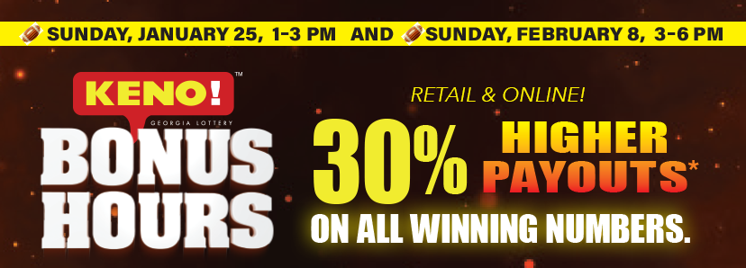 KENO! Bonus Hours increased payouts are not valid in combination with any other Lottery coupon or promotional offer. Play KENO! at GALOTTERY.COM, on the official Georgia Lottery mobile app, or at any Georgia Lottery retailer. Winning KENO! tickets purchased at retail or online (via galottery.com or the official Georgia Lottery mobile app) during the offer periods will receive a 30% higher payout than the standard payout. Offer period is from 1:00 pm ET to 3:00 pm ET on January 25, 2026 and from 3:00 pm to 6:00 pm on February 8, 2026. For tickets purchased online, winnings up to and including $600 will be credited to the player's iHOPE® account immediately following the KENO! draw; players will be notified via email how to claim prizes over $600.